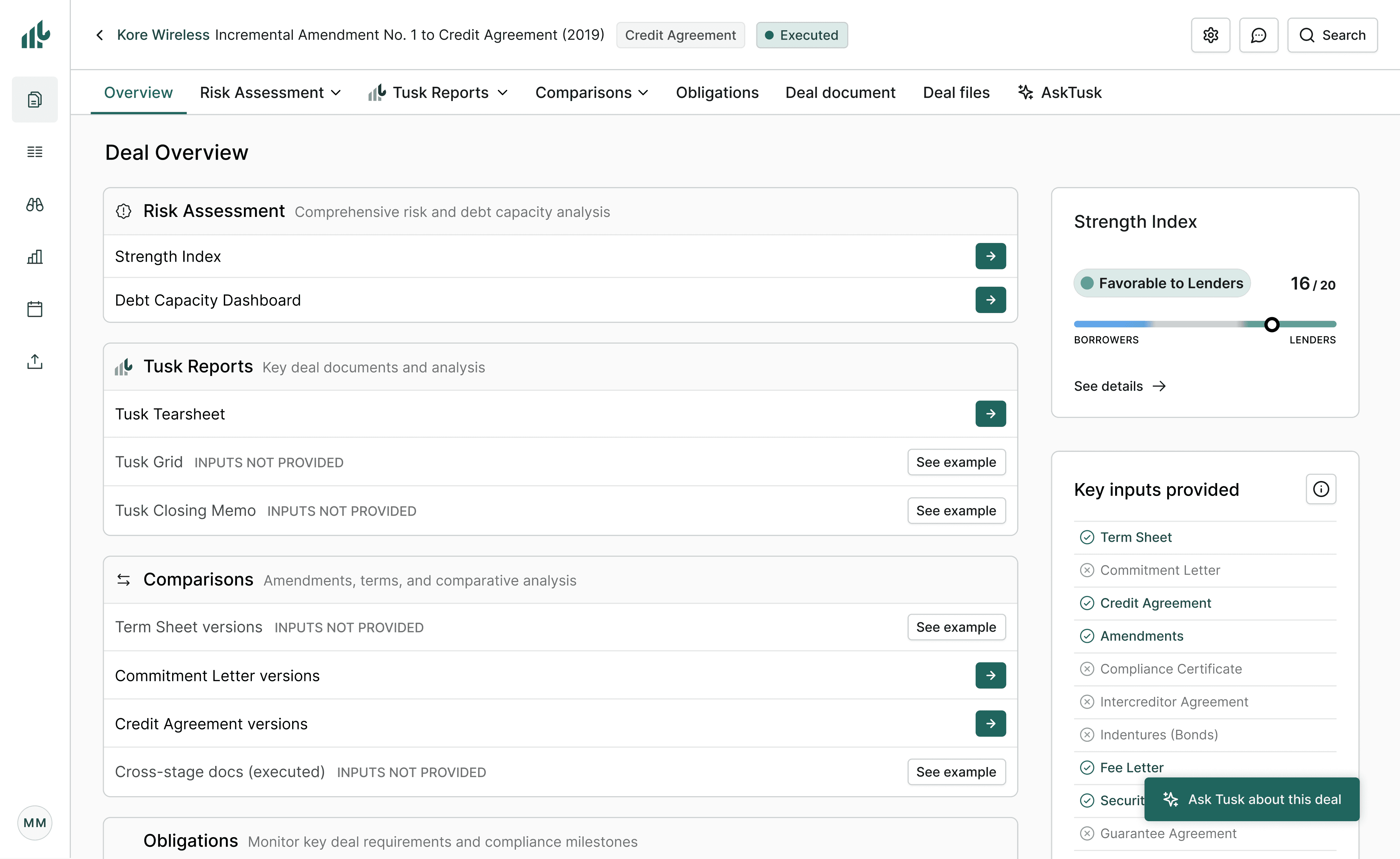 Tusk’s AI analyzes unstructured data across the credit lifecycle to reveal hidden insights. Validated by in-house lawyers and experts, we deliver speed, accuracy, and full compliance.